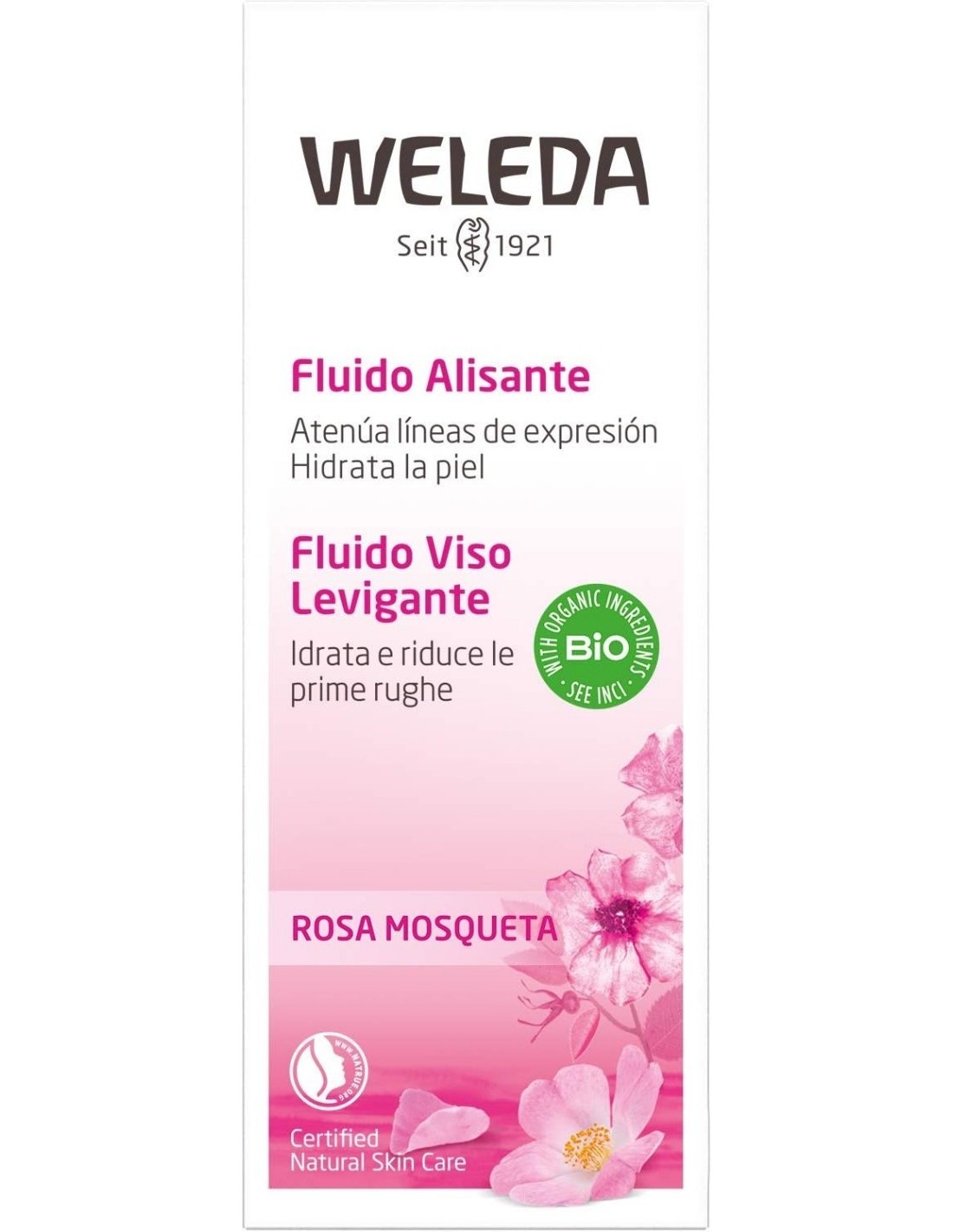WELEDAFluido hidratante antiedad formulado con ingredientes naturales capaces de atenuar arrugas finas, difuminar manchas y marcas, y unificar el tono y la textura de la piel, para un rostro liso, suave y luminoso. El Fluido Alisante Rosa Mosqueta es el tratamiento ideal para combatir el envejecimiento, reparar y revitalizar la piel de tu rostro.