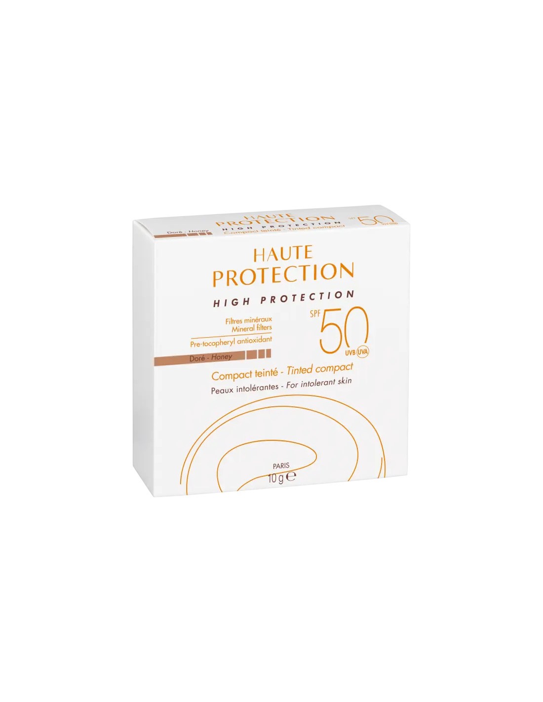 Compacto de color dorado con alta protección SPF 50 contra los rayos UVB y UVA, formulado específicamente para pieles sensibles o intolerantes.