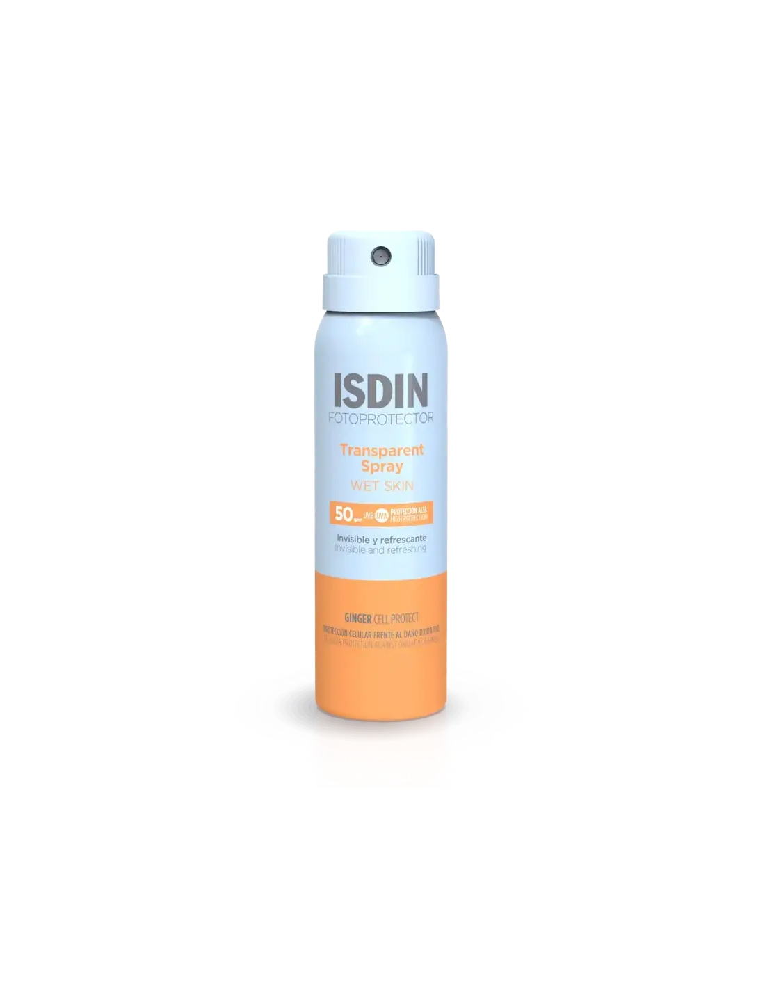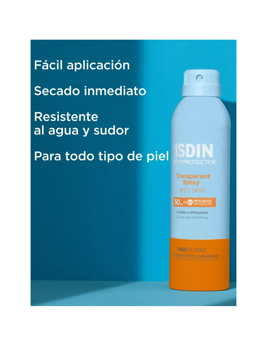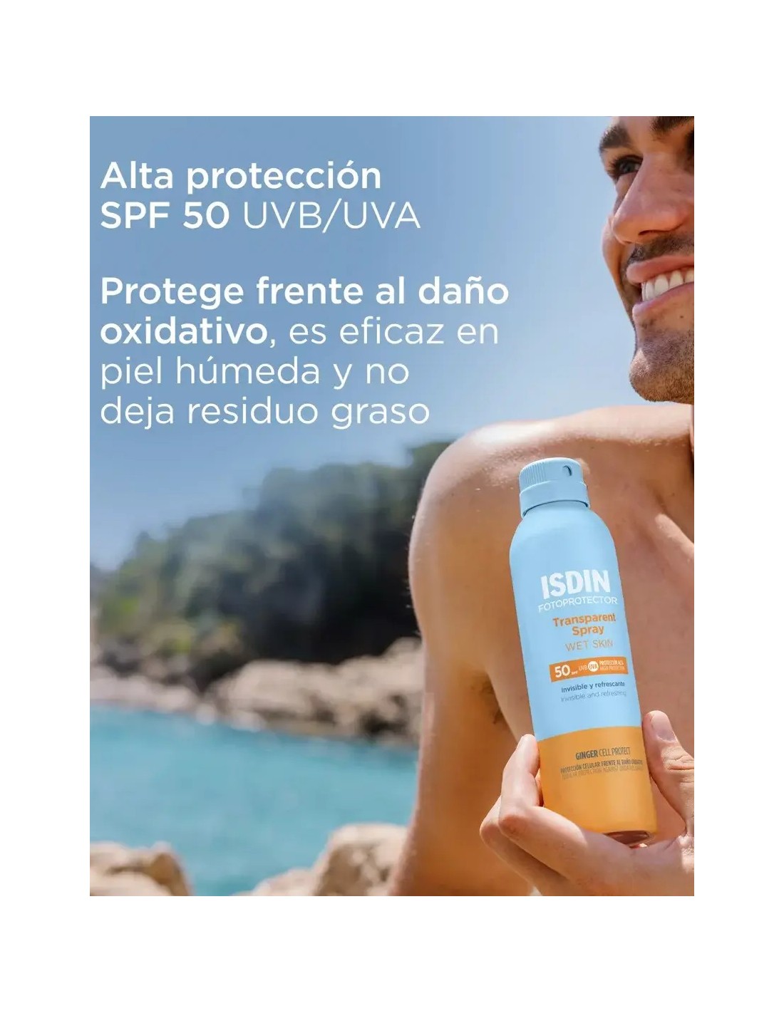 SPRAY TRANSPARENTE Isdin Fotoprotector Transparent Spray Wet Skin SPF 50 - 250 ml ISDIN - FOTOPROTECTOR 1974631 26,50 € Protector solar corporal SPF 50 frente a las radiaciones UVA-UVB, en spray multidireccional y con un acabado invisible, fresco y de absorción y secado inmediato. Diseñado específicamente para aplicar tanto en piel seca como en mojada sin perder el factor de protección. Contiene un gran poder antioxidante que favorece a la protección celular frente al...