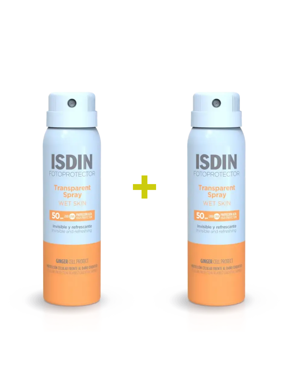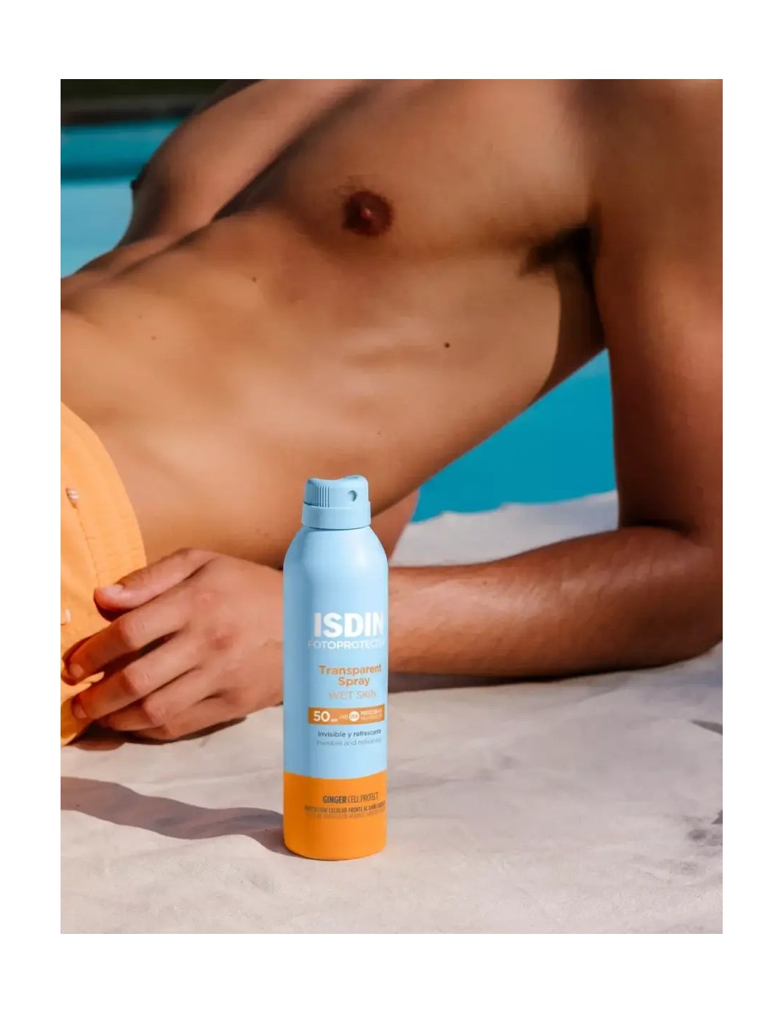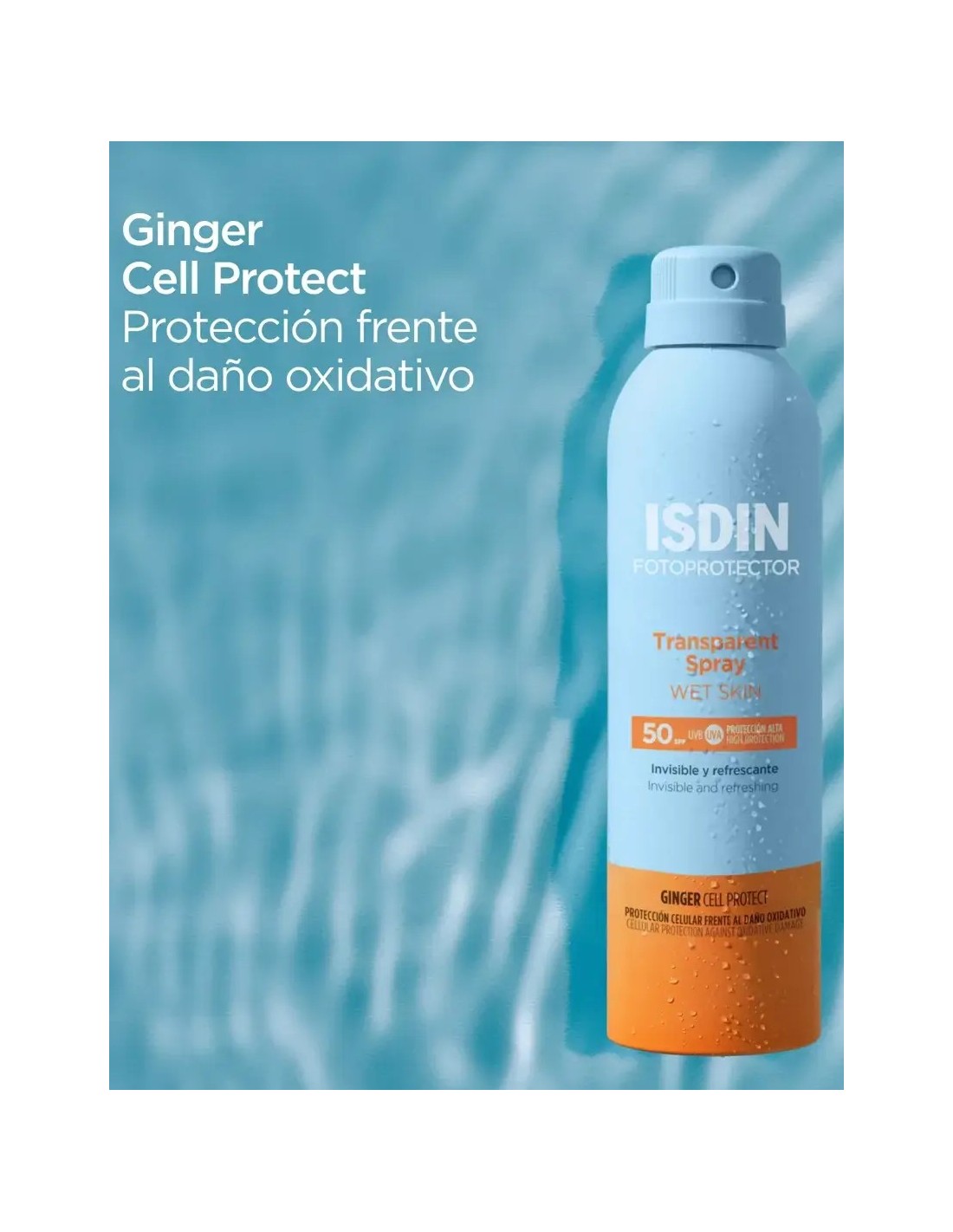 SPRAY TRANSPARENTE Isdin Fotoprotector Transparent Spray Wet Skin SPF 50 - 250 ml ISDIN - FOTOPROTECTOR 1974631 26,50 € Protector solar corporal SPF 50 frente a las radiaciones UVA-UVB, en spray multidireccional y con un acabado invisible, fresco y de absorción y secado inmediato. Diseñado específicamente para aplicar tanto en piel seca como en mojada sin perder el factor de protección. Contiene un gran poder antioxidante que favorece a la protección celular frente al...