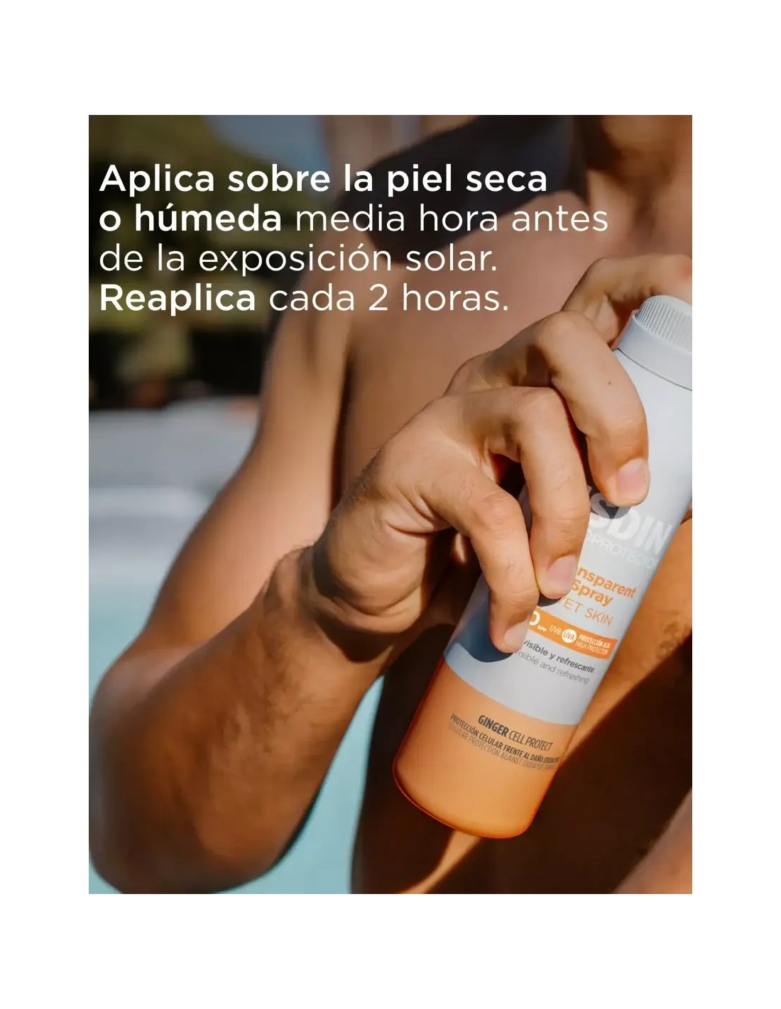 SPRAY TRANSPARENTE Isdin Fotoprotector Transparent Spray Wet Skin SPF 30 - 250 ml ISDIN - FOTOPROTECTOR 1974624 26,50 € Protector solar corporal SPF 30 frente a las radiaciones UVA-UVB, en spray multidireccional y con un acabado invisible, fresco y de absorción y secado inmediato. Diseñado específicamente para aplicar tanto en piel seca como en mojada sin perder el factor de protección. Contiene un gran poder antioxidante que favorece a la protección celular frente al...